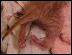 Mijn dierenarts had nog nooit iets dergelijks gezien. Wij spraken over euthanasie. Ik vond het hartverscheurend. Na veel discussie besloten wij het een tijdje aan te zien en af te wachten hoe het kitten zich zou ontwikkelen. Het zieke kitten dronk goed hoewel het geholpen moest worden met het kruipen naar zijn moeders flank aangezien het zich helemaal niet met zijn achterbeentjes kon afzetten. Ik legde warme kompressen aan, voerde strekoefeningen uit en verrichtte - zij het als amateur - enige fysiotherapie.